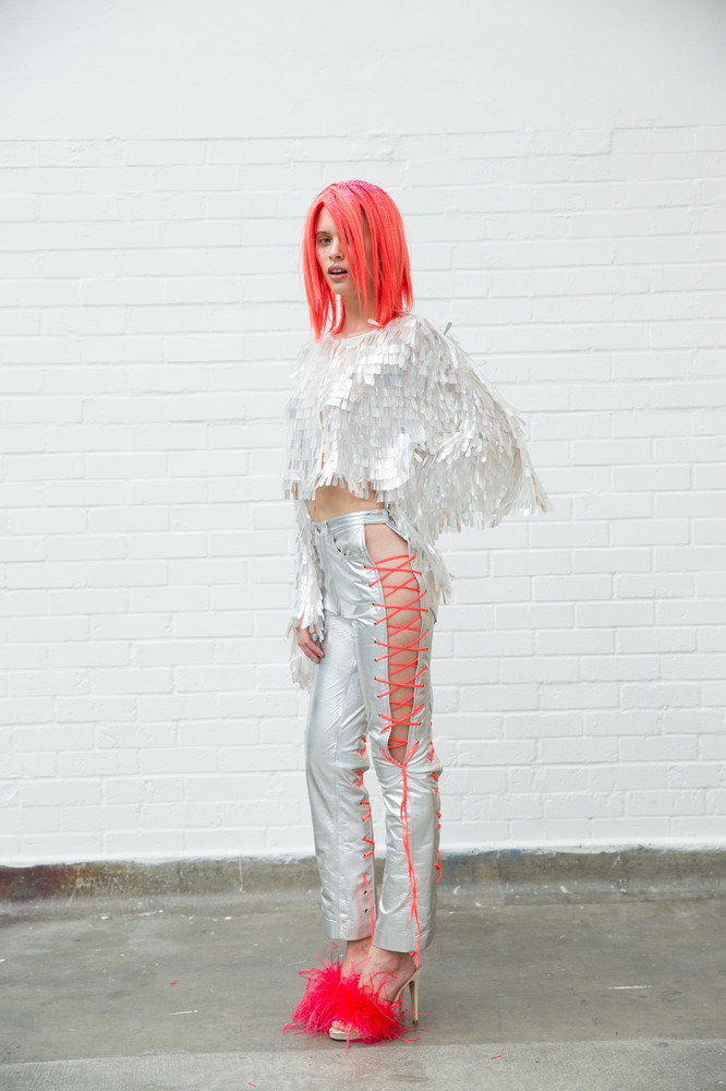 还有这件白色流苏上衣和撞色绑带裤,神似一只公鸡,与品牌倒是相当契合: