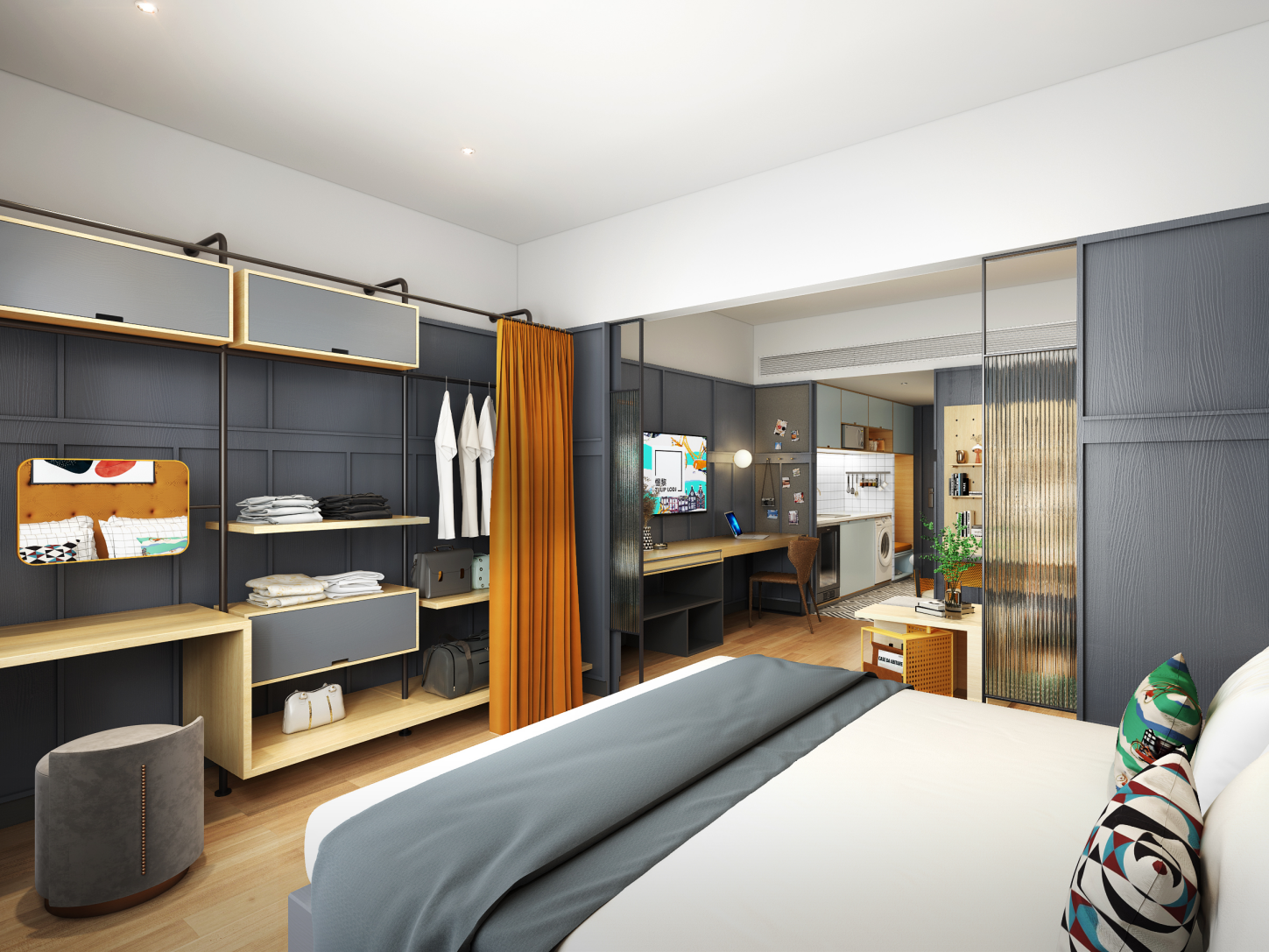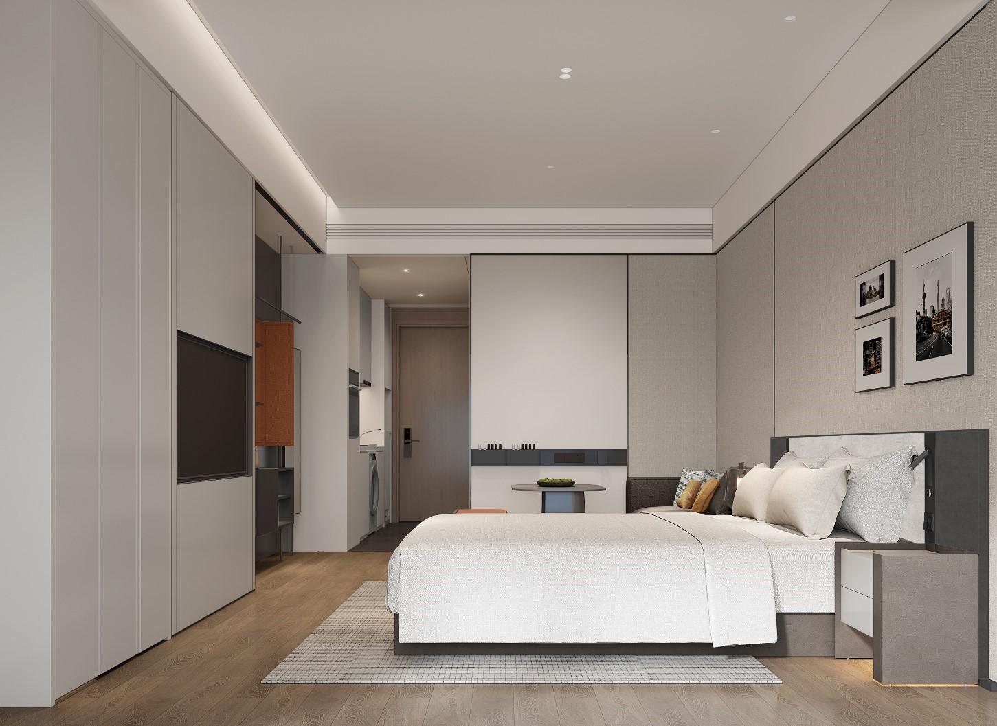 - 厨房:配备冰箱、洗烘一体洗衣机、微波炉、炊具,并根据不同房型需求增配抽油烟机及电磁炉、直饮净水器等,在满足住客生活烹饪需求的同时,确保健康生活环境。