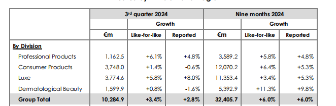 10月23日,欧莱雅集团(以下简称“欧莱雅”)公布2024年前三季度业绩。