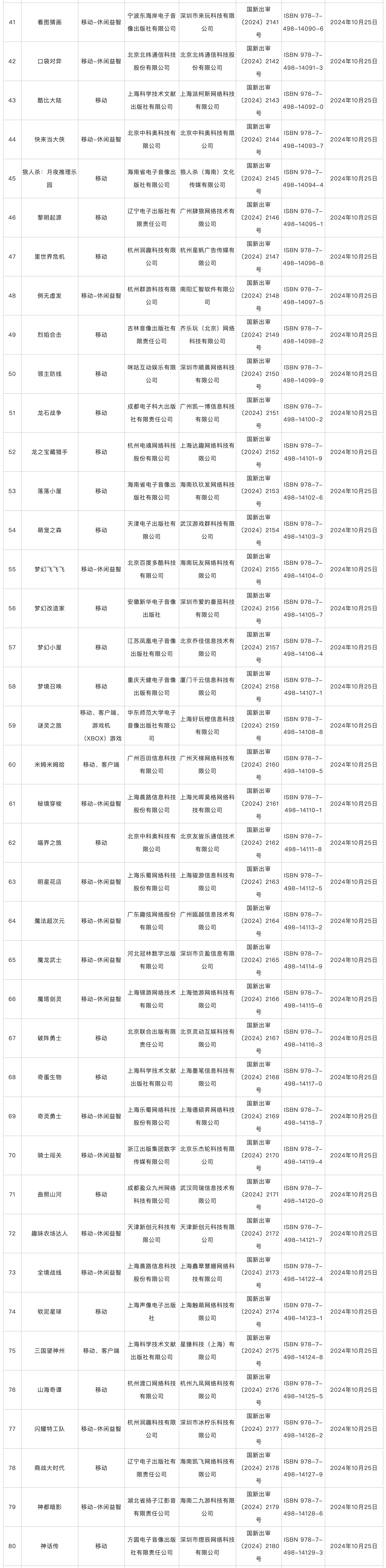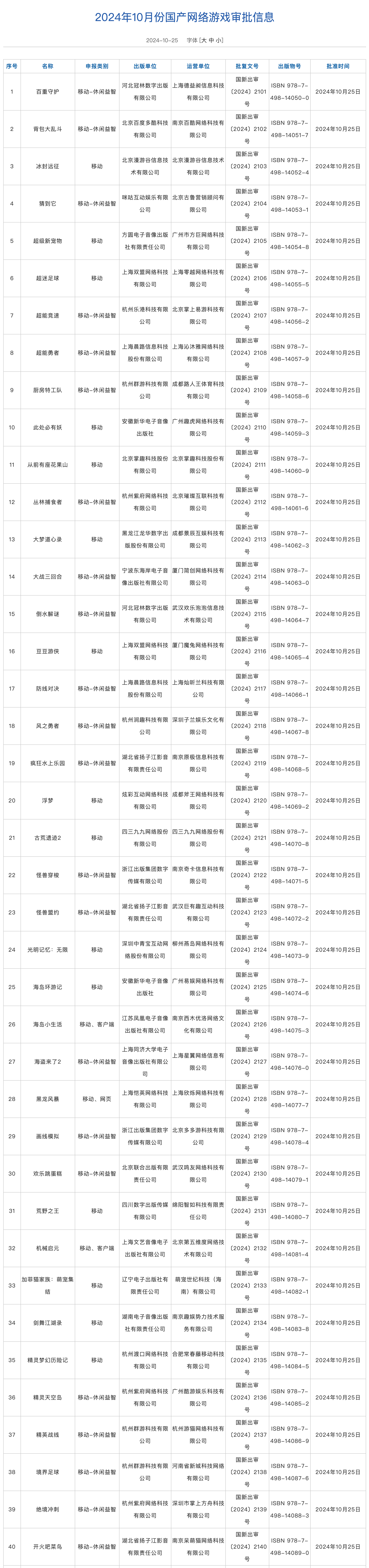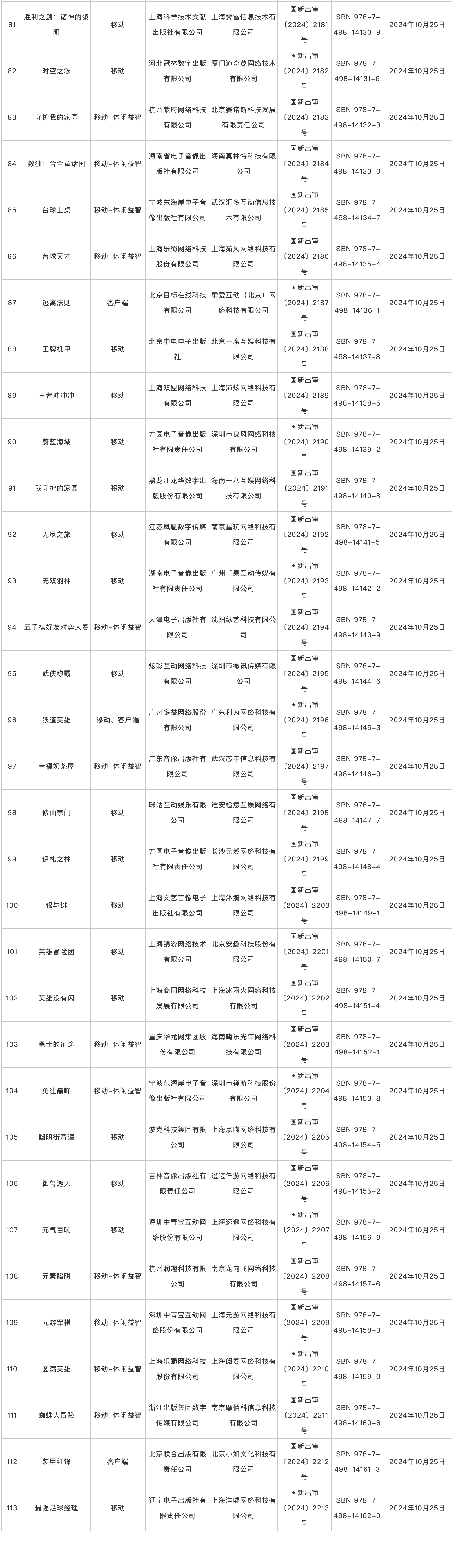 国家新闻出版署公布2024年10月份国产网络游戏审批信息,共113款游戏获批