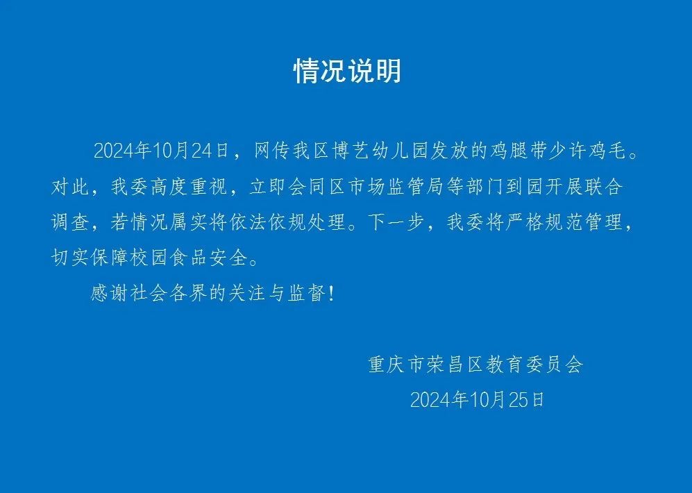 10月25日,重庆市荣昌区教育委员会发布情况说明:10月24日,网传我区博艺幼儿园发放的鸡腿带少许鸡毛。对此,我委高度重视,立即会同区市场监管局等部门到园开展联合调查,若情况属实将依法依规处理。下一步,我委将严格规范管理,切实保障校园食品安全。
