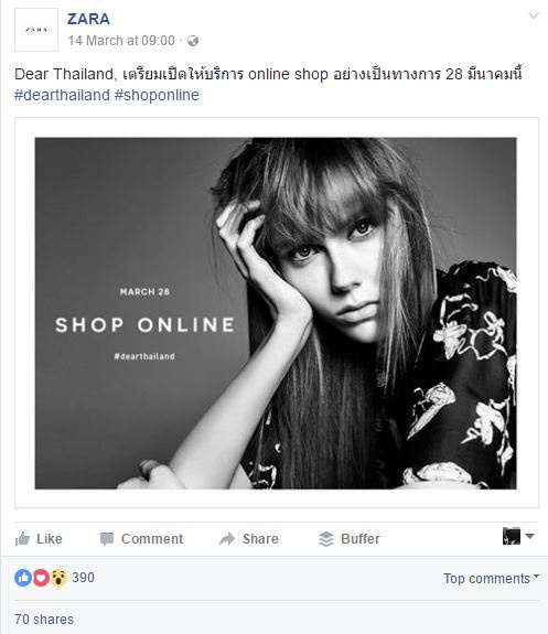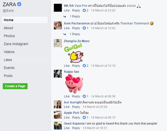 (Facebook泰国站关于Zara的用户反馈)