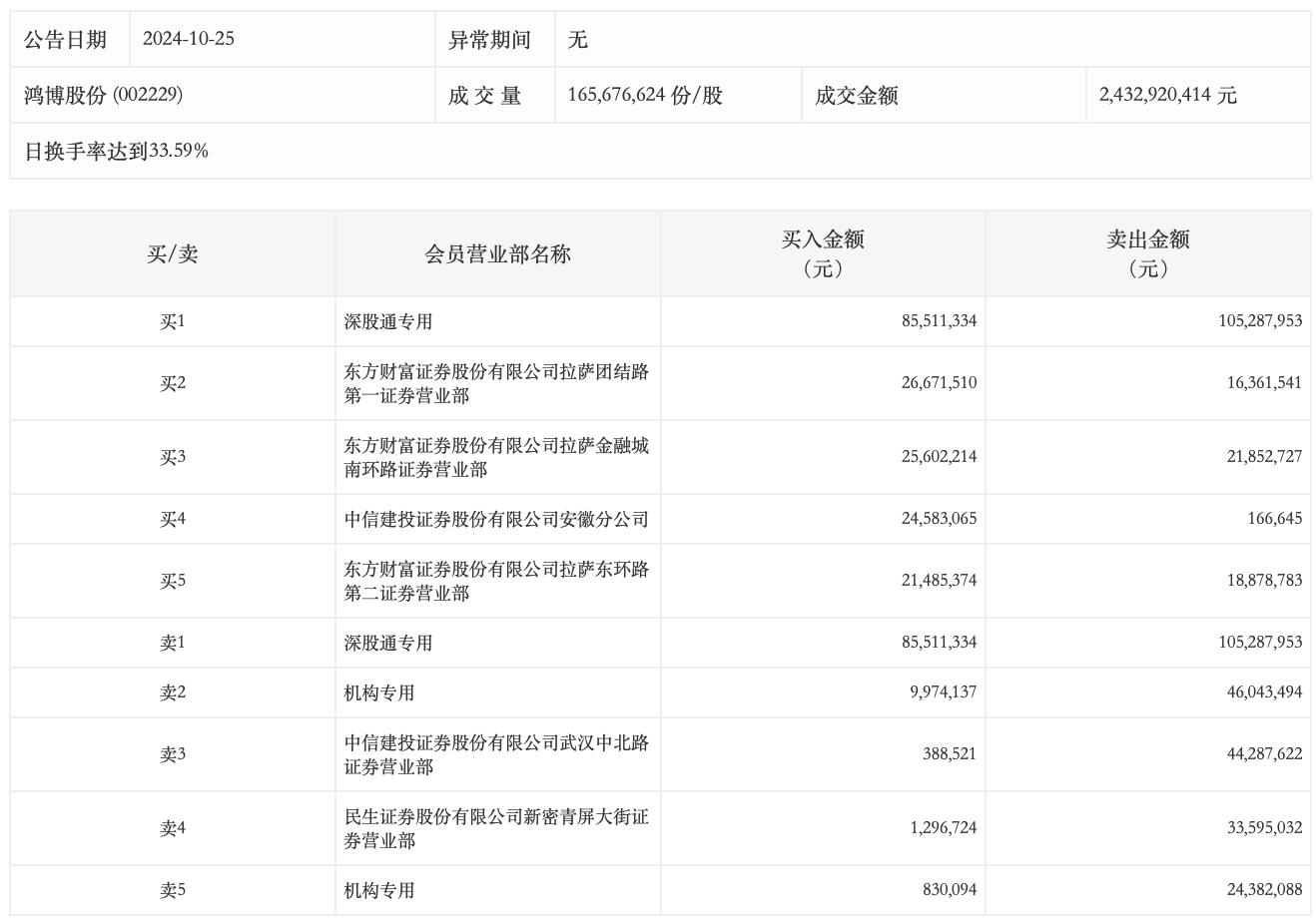 10月25日,鸿博股份今日涨停,龙虎榜数据显示,上榜营业部席位全天成交5.07亿元,占当日总成交金额比例为20.85%。其中,买入金额为1.96亿元,卖出金额为3.11亿元,合计净卖出1.15亿元。