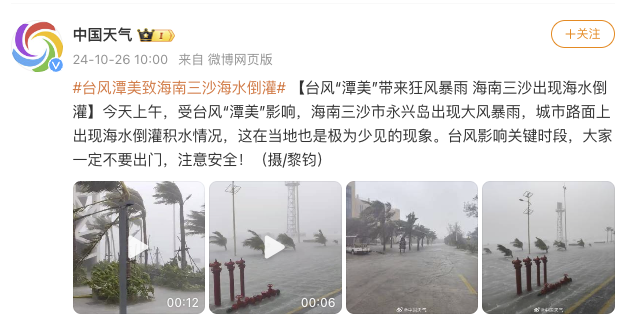 今天上午,受台风“潭美”影响,海南三沙市永兴岛出现大风暴雨,城市路面上出现海水倒灌积水情况,这在当地也是极为少见的现象。台风影响关键时段,大家一定不要出门,注意安全。(中国天气)