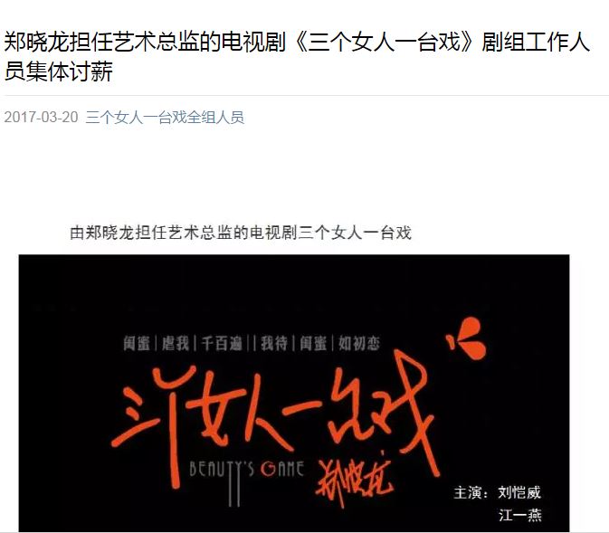 昨日(3月20日),“三个女人一台戏全组人员”微信公众号发布了一篇文章《郑晓龙新剧〈三个女人一台戏〉剧组人员讨薪》,文章称制片人李晓伟拖欠全剧组工作人员工资及各类费用共计约900万,承制方浙江小玩家影视股份有限公司制片人、法人、董事及公司财务等集体消失,导致剧组停机。并且由于拖欠酒店房费,酒店限制剧组工作人员自由,并停电停水,扣车等,目前,工作人员食宿皆成问题。