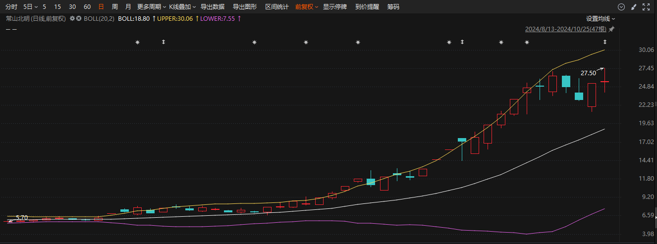 10月28日,常山北明竞价高开8.47%,报27.8元/股,截至发稿,该股盘中涨逾5%。