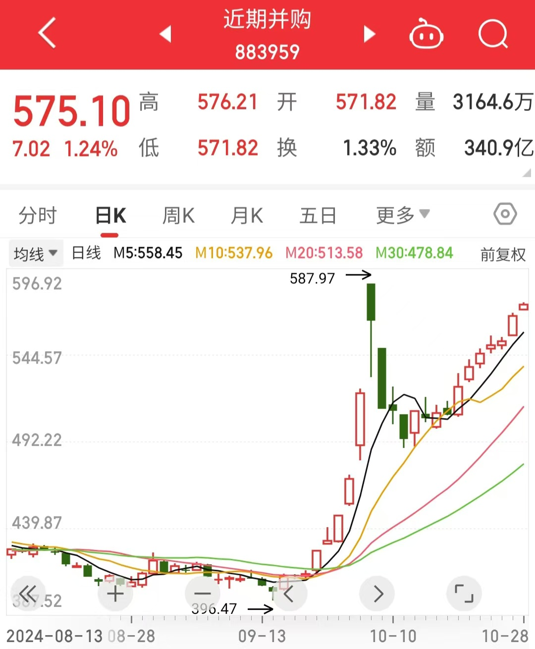 而此次常山北明的置换方案无疑使公司又沾上了并购重组概念。根据同花顺近期并购板块的数据显示,近期该板块走势十分强劲,有突破10月8日高点的趋势。板块内部更是有走出26天23板的双成药业(002693.SZ)、10天9板的文一科技(600520.SH)、6天5板的上海电气(601727.SH)、6连20cm涨停的富乐德(301297.SZ)等等。