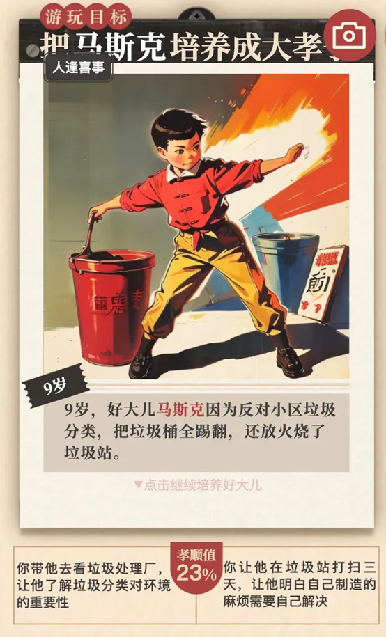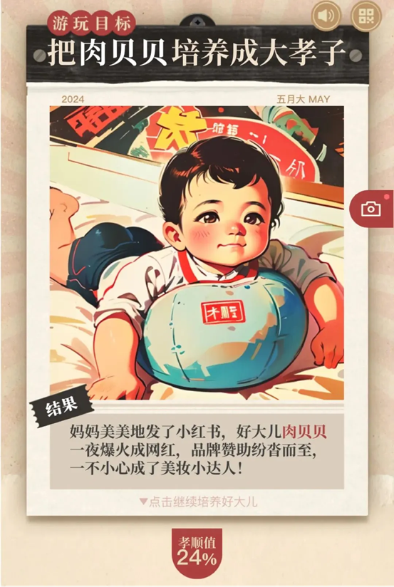从玩法机制上来说,这才是考验AI游戏“内功”的地方。当然,《换你来当爹》的玩法仅限于生图,核心有趣点还是来自用户的奇思妙想,游戏机制本身没有多复杂,这限制了其生命力。