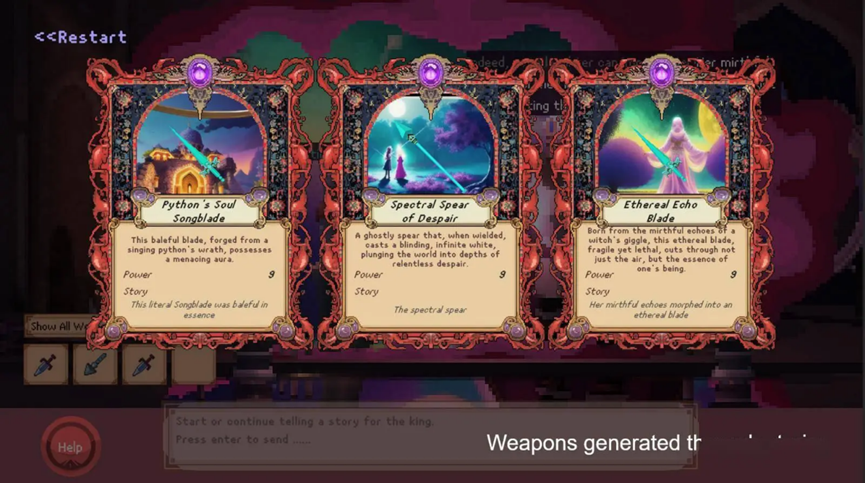 但其最出众的设计就在于:玩家既在通过千变万化的故事,来触发相应的武器关键词的同时,扮演国王的LLM,又不会因为不合游戏背景、设定的关键词,而破坏游戏整体的统一感。