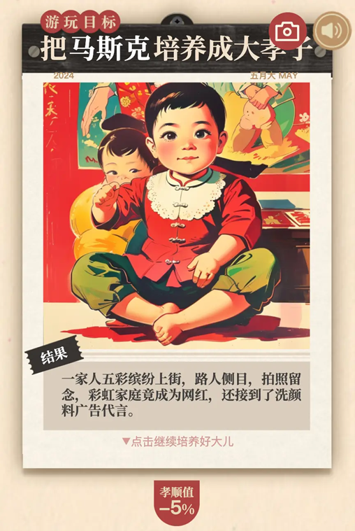 《换你来当爹》由上海狸谱科技有限公司发行,游戏中的剧情和对应图片全部由LLM(大语言模型)实时生成,游戏的玩法,是通过一个个卡片式的选项,对游戏中出现的随机事件不断做出选择,从而一步步将游戏角色培养成「大孝子」!