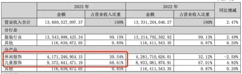财报显示,2023年,森马儿童服饰产品实现营收93.73亿元,同比增长4.92%,占比达到68.61%,儿童服饰的毛利率为46.78%;休闲服饰产品实现营收41.71亿元,同比下降2.58%,毛利率为38.02%。