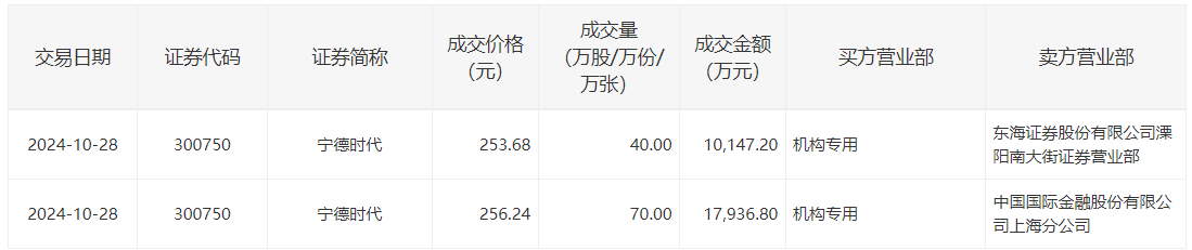 宁德时代10月28日大宗交易成交110万股,成交额2.81亿元,占当日总成交额的3.83%,成交均价255.31元,较市场收盘价256.24元折价0.36%,其中最高成交价256.24元,最低成交价253.68元。