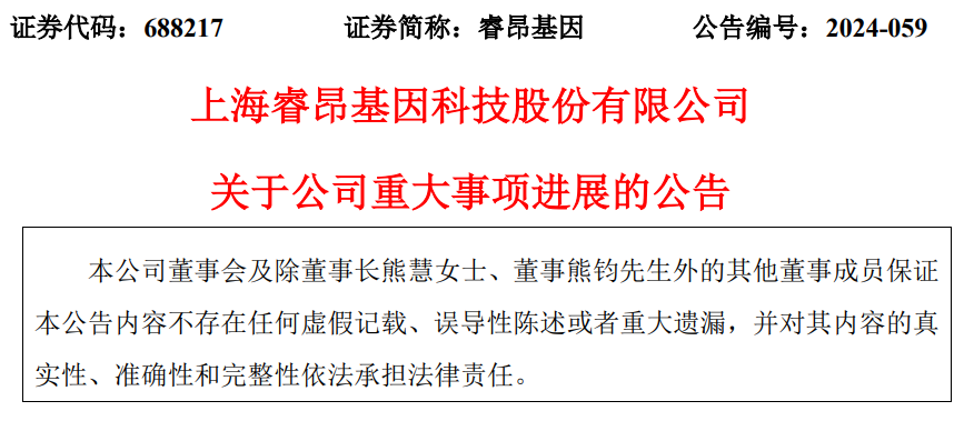 在百济神州大中华区首席商务官殷敏被带走调查后,专注于肿瘤检测领域的睿昂基因(688217.SH)也紧接着公告,公司实际控制人、董事长兼总经理、核心技术人员熊慧,实际控制人、董事兼副总经理熊钧,副总经理薛愉玮以及副总经理何俊彦四人,因涉嫌诈骗被公安机关刑事拘留。