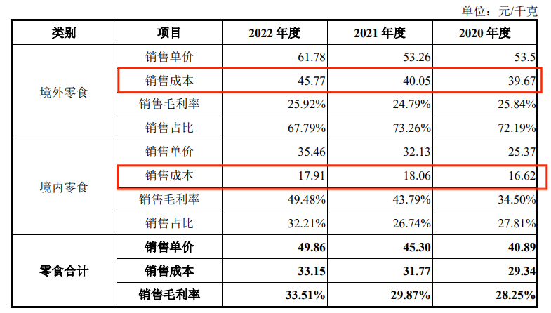 此前,乖宝宠物的产品售价就一直在走高。其披露的招股书显示,2020年至2022年,零食平均每千克销售单价从40.89元上涨到49.86元,每年增长幅度在10%以上。