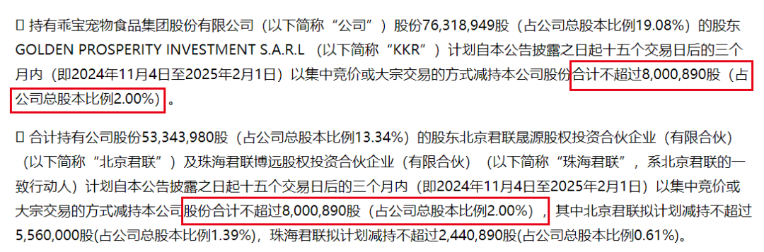 10月10日,乖宝宠物发布公告称,KKR计划在披露公告之日起15个交易日后的三个月内减持公司股份不超过2.00%股权(800.09万股)。与此同时,北京君联及一致行动人珠海君联计划在相同时间内,同样减持乖宝宠物不超过2.00%股权(800.09万股)。