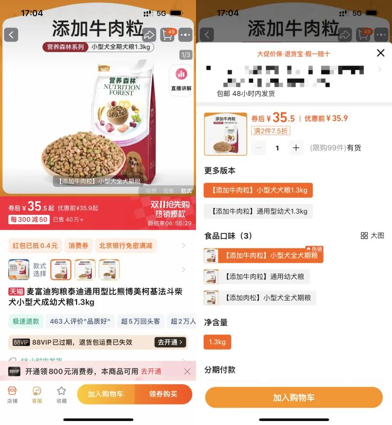 10月24日,创业最前线在麦富迪天猫旗舰店查询发现,一款热销40万+的营养森林系列“小型犬全犬期粮(添加牛肉粒)”1.3kg售价35.5元,约27元/kg。