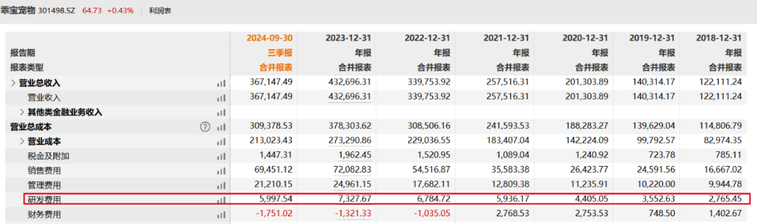 但在研发上,乖宝宠物投入的资金甚至不到销售费用的十分之一。2024年前三季度,公司的研发费用5997.54万元,同比微增7.78%。