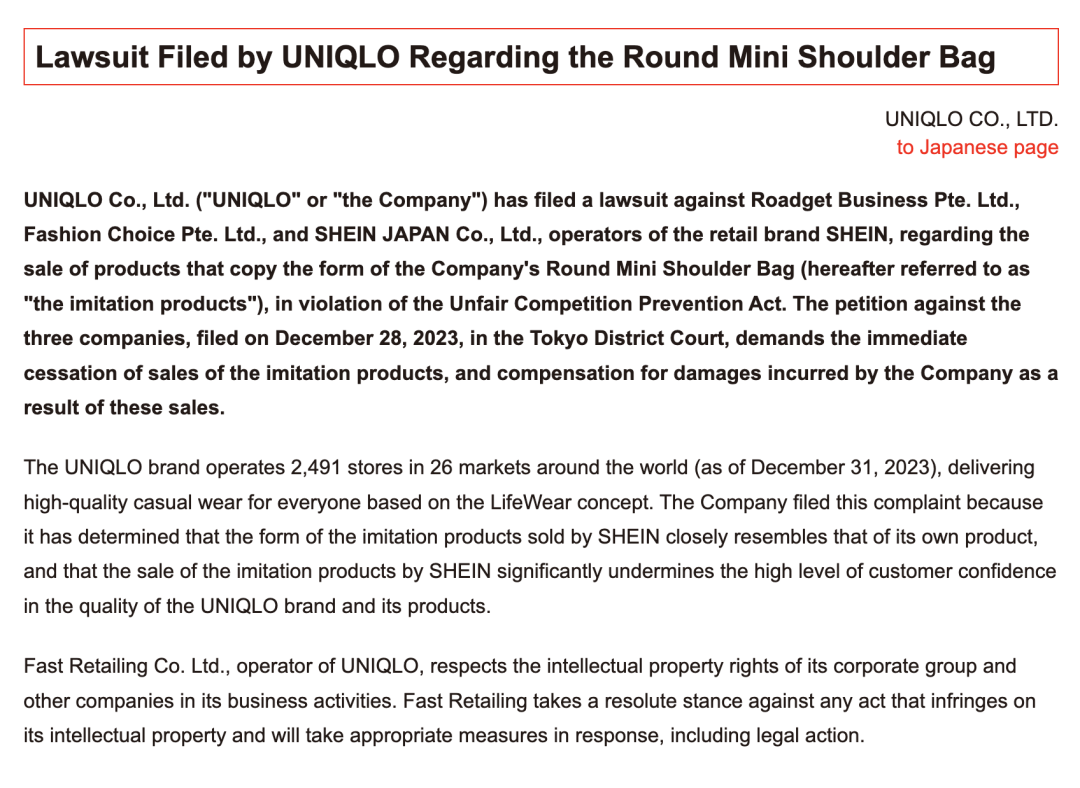 今年 1 月,优衣库母公司迅销集团在东京提起诉讼,认为 SHEIN 销售仿制品,侵犯知识产权,要求其停止相关产品的销售并支付约 1.6 亿日元的赔偿。在今年 10 月的记者会上,柳井正被问到相关问题时表示,“虽然速度值得学习,但谁都能做到。从国际标准的水平和道德来看,( SHEIN 的做法)不是违法的吗?不会长久的”。