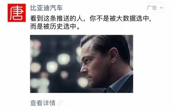 2017年2月28日0点至3月1日24点,比亚迪为了推广新能源汽车唐100的上市,在微信朋友圈投放了一条视频原生广告,主角是李奥纳多,文案只有一句话,“看到这条推送的人,你不是被大数据选中,而是被历史选中。”