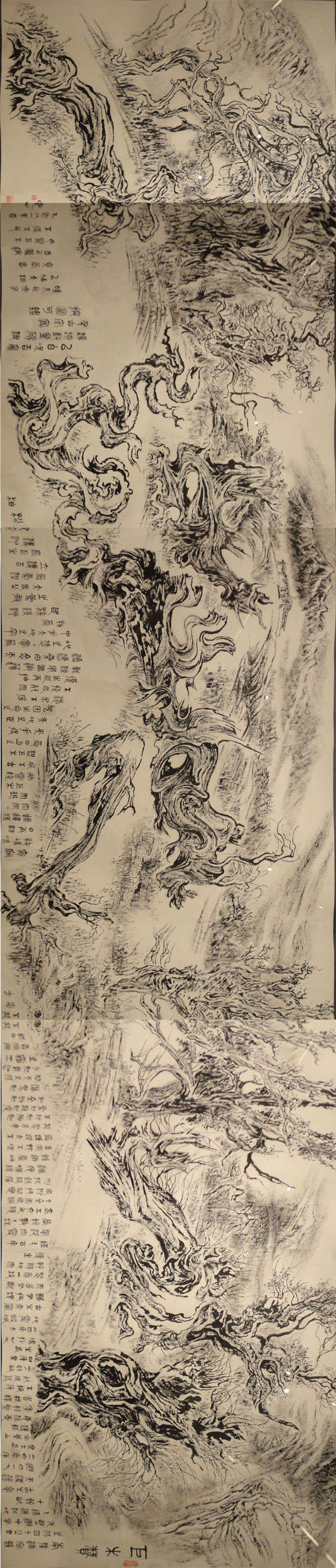 1981年,张仃来到新疆,他被戈壁滩上大片的胡杨林深深吸引,这种被压抑之后的反抗让经历了无数磨难的张仃徘徊了很久,创作出幅长近5米的焦墨巨作《巨木赞》。某种意义上,《巨木赞》可以算是张仃的自画像。