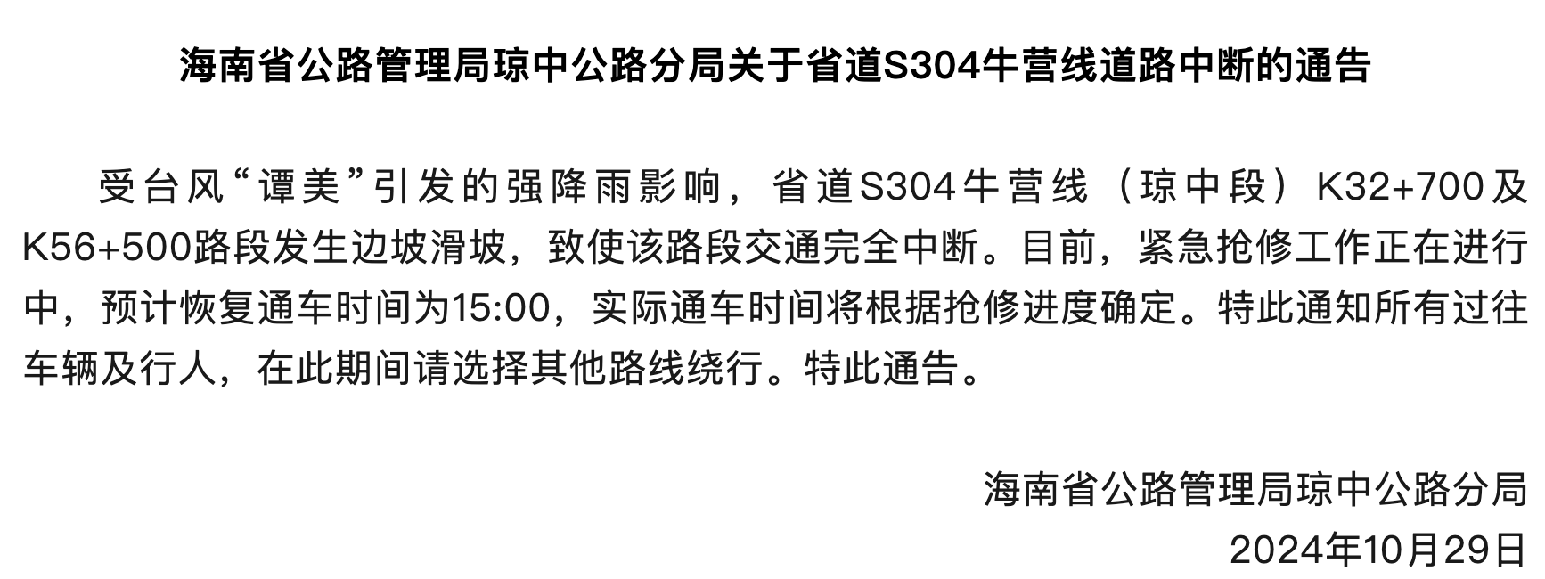 海南省交通运输厅官微消息,海南省公路管理局琼中公路分局10月29日发布通告,受台风“谭美”引发的强降雨影响,省道S304牛营线(琼中段)K32+700及K56+500路段发生边坡滑坡,致使该路段交通完全中断。目前,紧急抢修工作正在进行中,预计恢复通车时间为15:00,实际通车时间将根据抢修进度确定。特此通知所有过往车辆及行人,在此期间请选择其他路线绕行。