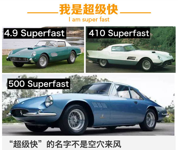 法拉利推出Superfast这个命名并不是空穴来风,早在1956年法拉利便以410 Superfast开创了“超级快”的历史首章。为了主打美国市场,410 Superfast采用美国车最流行的“飞机垂尾”式设计,张扬的外观并没有让其正式量产。