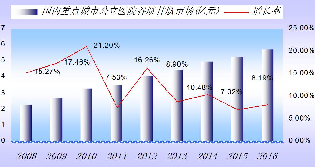 还原型谷胱甘肽是人类细胞质中自然合成的一种肽,由谷氨酸、半胱氨酸和甘氨酸组成。2016年,国内重点城市公立医院谷胱甘肽是抗脂肪肝居于首位的药物,已达到了5.73亿元,同比上一年增长了8.19%。CFDA批准国内5家生产谷胱甘肽口服及注射制剂,此外还有进口药物。医院使用的谷胱甘肽TOP5药物是重庆药友的阿拓莫兰占据了45.91%,上海复旦复华药业的双益健占据了20.33%,意大利斯德药厂的古拉定占据17.88%,昆明积大的松泰斯占据了8.34%,山东绿叶的绿汀诺占据了6.3%。推测国内谷胱甘肽总体市场已超过了50亿元的规模,随着市场需求,将表现出平稳增长的态势。