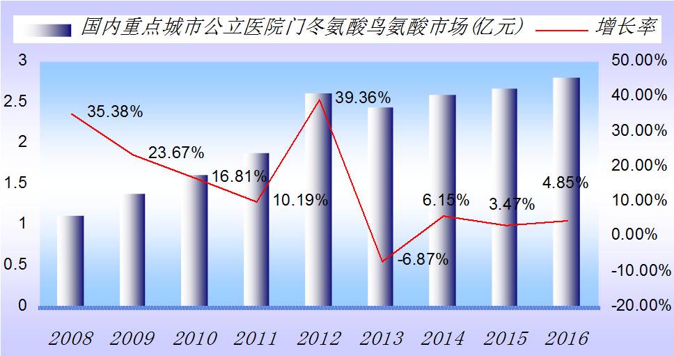 2016年,国内重点城市公立医院门冬氨酸鸟氨酸市场为2.81亿元,同比上一年增长了4.85%。其中武汉启瑞药业占据了90.96%的市场份额,德国Merz占据了9.04%。
