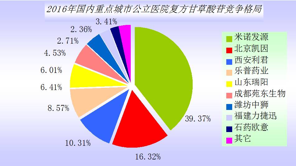 2016年,国内重点城市公立医院复方甘草酸苷市场为3.8亿元,同比上一年增长了4.28%。TOP10格局显示进口药物美能占据39.37%,国产药占据了60.63%。
