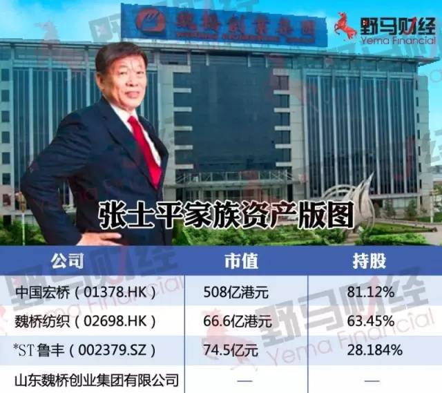 据野马财经(微信公号:ymcj8686)不完全统计,张士平主要持股的上市公司有中国宏桥、魏桥纺织(02698.HK)和才收购股份不久的*ST鲁丰(002379),仅以这些公司市值及持股比例计算,张士平家族的财富就达到了426.49亿元人民币。