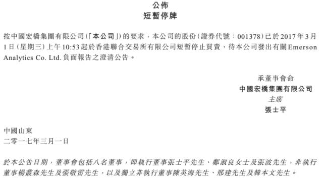 中国宏桥于是在3月6日发布公告,称Emerson Analytics发布做空报告为无理恶意指控,欲破坏中国宏桥的声誉、操纵公司股份价格及故意打击市场,恶意竞争,并宣布于3月7日起复牌。