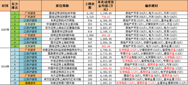 ▼2007年与2016年龙虎榜成交实力排名前十的营业部完全不同