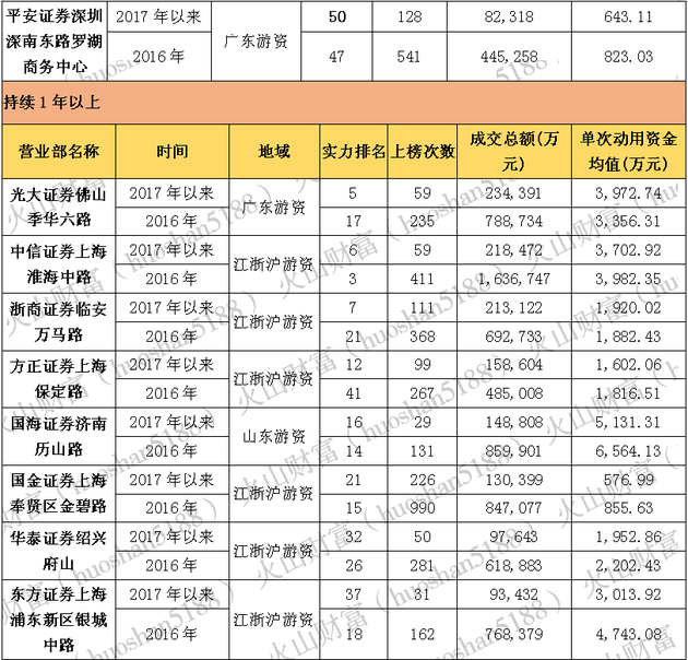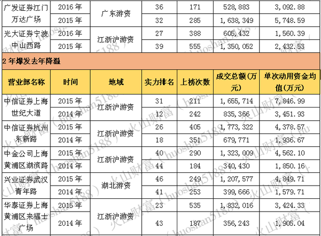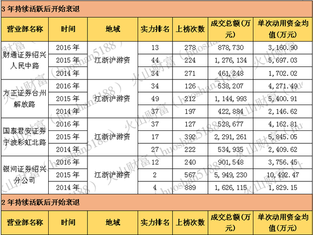 由上表不难发现,就有华泰深圳益田路荣超商务中心证券营业部这类游资江湖不老松,也有此前红极一时但近一两年势头明显减弱的营业部。