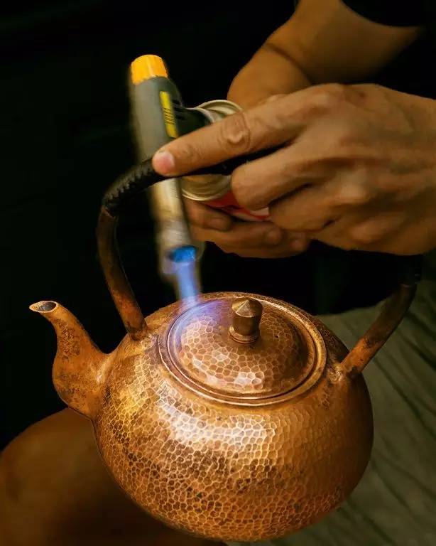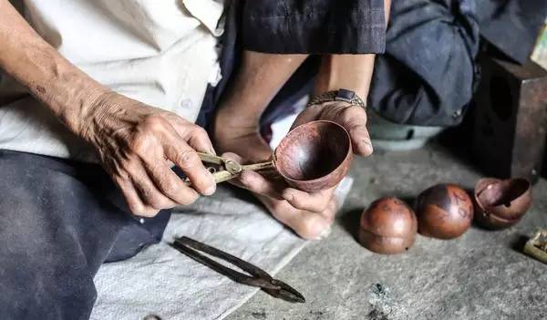 阿公徒手握着烧红的烙铁往铜球边不停触碰