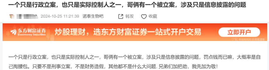 对此,股民众说纷纭,有人认为:“多久之前的事情了,现在有什么好说的,还是要看公司能不能赚钱。”也有人认为:“一个只是行政立案,也只是实际控制人之一,哥俩有一个被立案,涉及只是信息披露的问题,罚点钱而已嘛,大概率是自己掏腰包。只要不是刑事立案,不是财务造假,其他都不是什么大问题。