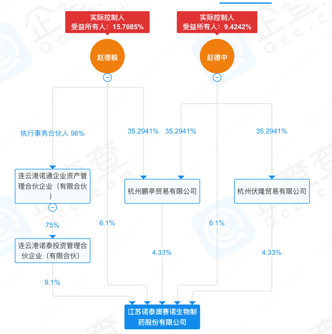 截至今年上半年,赵德毅、赵德中兄弟二人分别直接只有公司6.1%股权,并通过伏隆贸易、鹏亭贸易间接持股,且二人为一致行动人,合计直接、间接持有诺泰生物25.7%的股权,以及30.63%的表决权,为公司实际控制人。