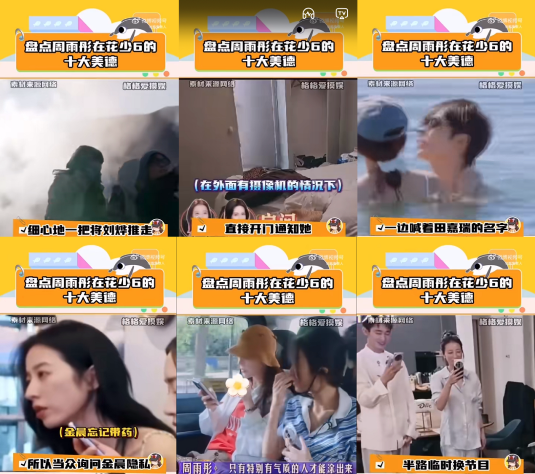 在目前B站、豆瓣、抖音的主流声音里,《花少6》成了足以对标《花少2》的“恶人修罗场”。尤其周雨彤的诸多争议行为成为热门课件,比如《煽动陈好批斗大会》《推开刘烨自拍》《私拆田嘉瑞送金晨礼物》《下水抱着侯明昊叫田嘉瑞》《主导四个人吃一桌外卖让其他人吃剩饭》等,她也因此被网友认定是过分自高自大的NPD(自恋型人格障碍)并冠之以了“花学慈禧”的至尊名号。