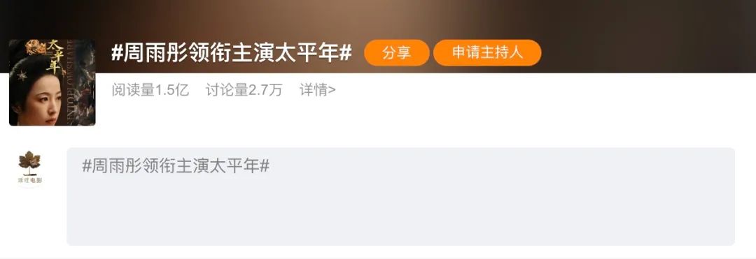 就在最近全网声讨周姐的争议声中,10月27日一条名为 #周雨彤领衔主演太平年# 的话题突登了微博热搜第一。由华策影视出品的历史正剧《太平年》是实打实的大剧项目,此项目消息的官宣也表明,周雨彤并没有因为风波影响其事业发展。