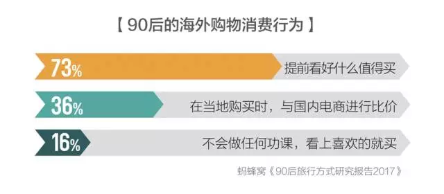 与人们对90后“挥霍浪费”的普遍印象不同,90后实则是更为精明的消费者。数据显示,73% 的90后会在出国前提前列好购物清单,力图让这场旅行值回票价。甚至有36%的90后会一边现场血拼,一边利用国内电商平台比价,精打细算到极致。