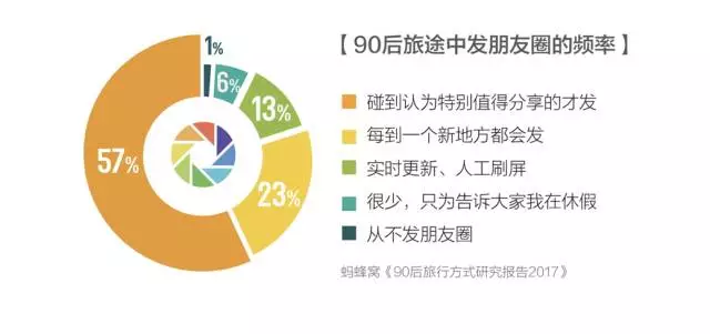 90后的社交习惯与心理,在旅行场景中能得到充分体现。57%的90后会精修图片,字斟句酌,以相当认真的态度发送每一条朋友圈。13%的人甚至会用自拍、美食、美景人工“刷屏”。