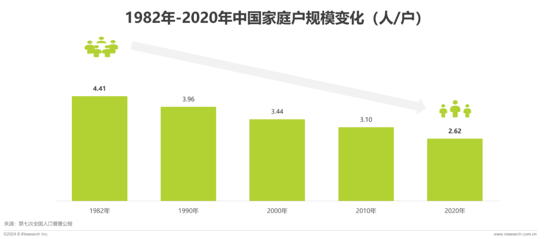 我国家庭规模趋于小型化。受中国人口流动日趋频繁、住房条件改善、年轻人婚后独立居住等因素的影响,家庭户平均规模降至2.62人。家庭变小,生活也更加精致化,消费上“单/双人套餐”、“一人食”、“一人游”等定制服务也越来越受欢迎。
