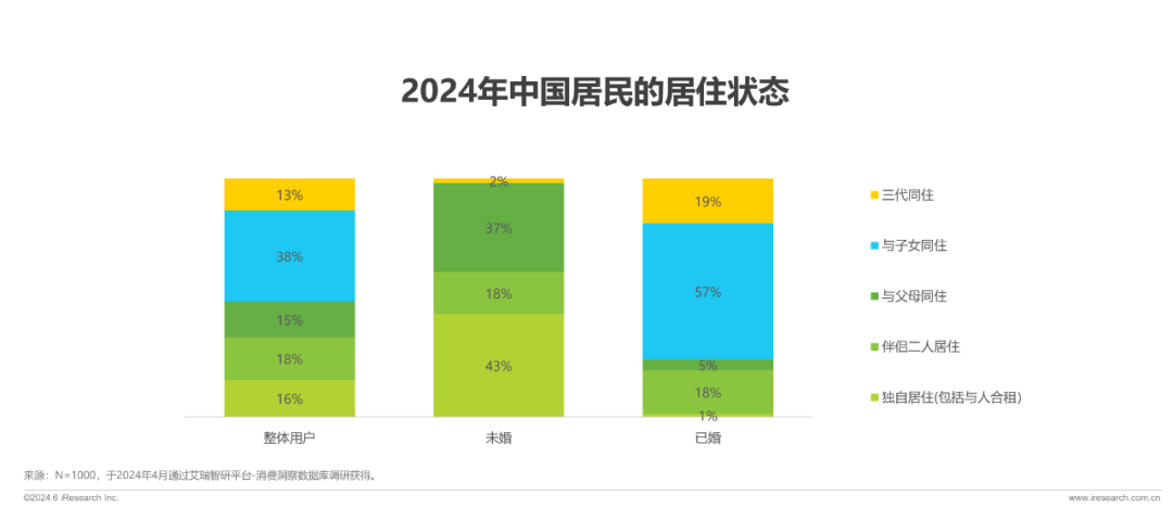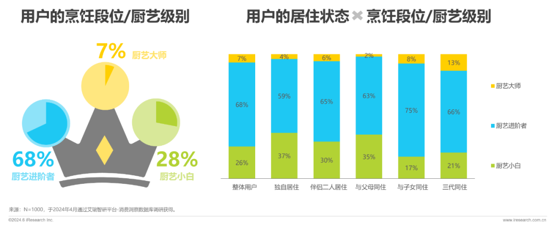 厨艺的进阶与居住状态相关,在成家且与子女同住之后,下厨频率主动或被动增高,75%的人成为厨艺进阶者;复杂的居住结构之下,厨艺大师的比例更高。
