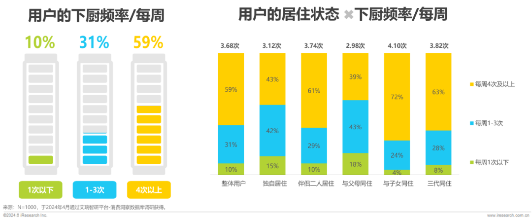 社会单元逐渐缩小,加上厨艺水平有限,让居民在家做饭的人均成本,包括时间成本、食材成本、机会成本、心理启动成本越来越高。但我国居民做饭场景仍在,90%的消费者每周至少做一次饭,整体用户平均每周下厨3.68次。