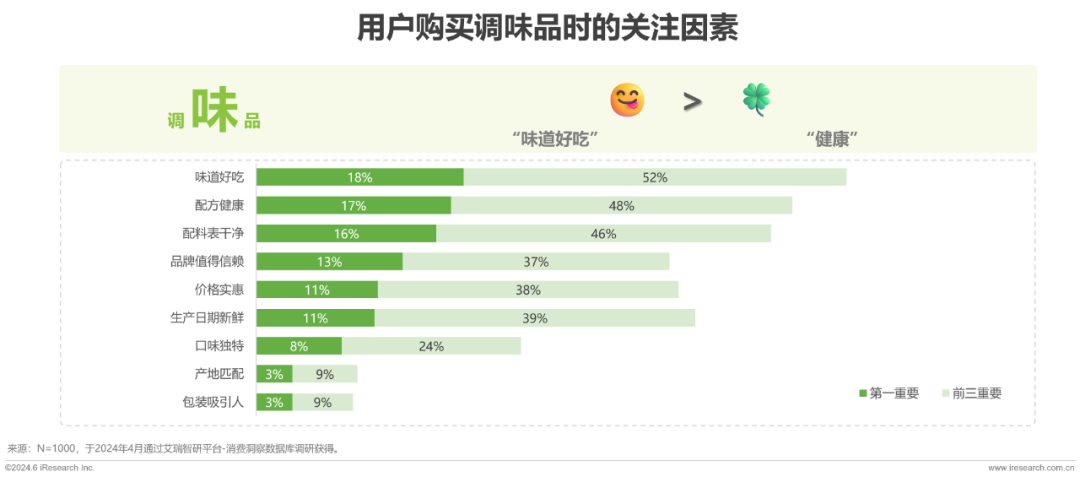 “味道好吃、配方健康、配料表干净”是用户购买调味品的三大关注因素