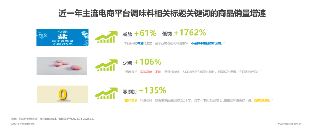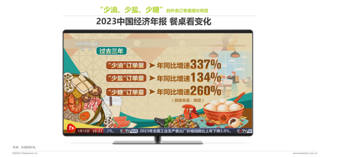 餐桌上“少油、少盐、少糖”的外卖订单量与调味品中“减盐/低钠”“少糖”“零添加”产品量均增长明显。