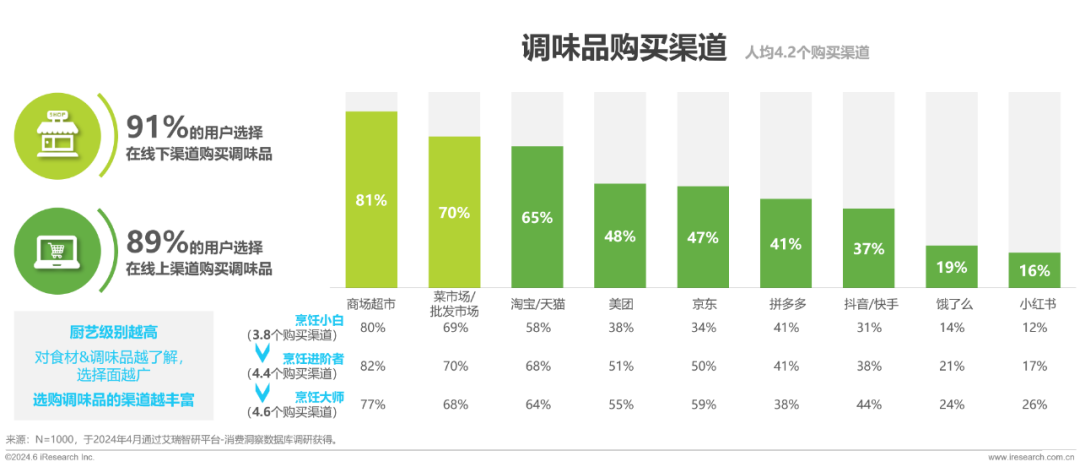厨艺级别越高,选购调味品的渠道越丰富,烹饪进阶者人均4.4个购买渠道,烹饪大师人均4.6个购买渠道。