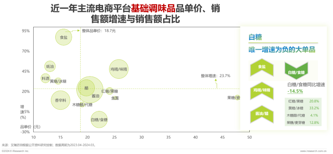 食盐增速近90%,增长势头猛进;酱油仍具大单品优势,贡献了25%以上的市场份额;白糖/食糖成为唯一增速为负的大单品。