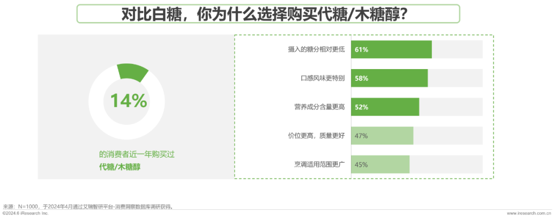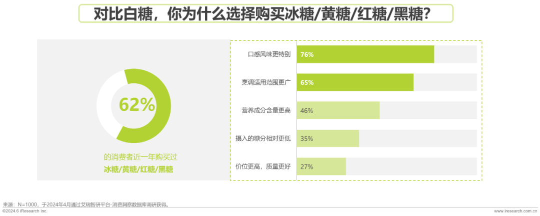 对比白糖,具备“风味更特别”“烹饪范围更广”调味特征的冰糖/黄糖/红糖/黑糖,和“摄入的糖分更低”“低糖低热量”健康特征的代糖/木糖醇受到消费者青睐