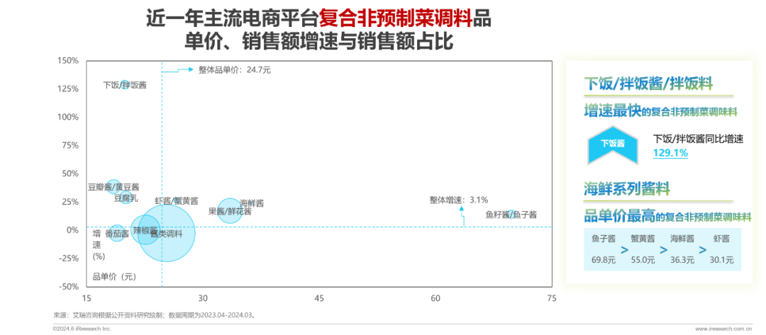 随着鱼虾水产等海鲜登上餐桌,鱼子酱、蟹黄酱等高单价调味品也受到消费者喜爱,平均增速均在10%以上。