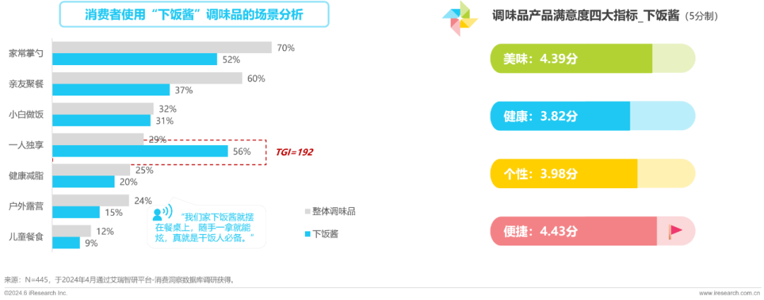 消费者使用下饭酱的最主要场景就是“一人独享”,占比高达56%。一个人吃饭的时候更不想折腾,省事很重要,用户对下饭酱产品的便捷性最满意(4.43分)。同时,重油高钠的下饭酱在健康属性上仍有待提升。